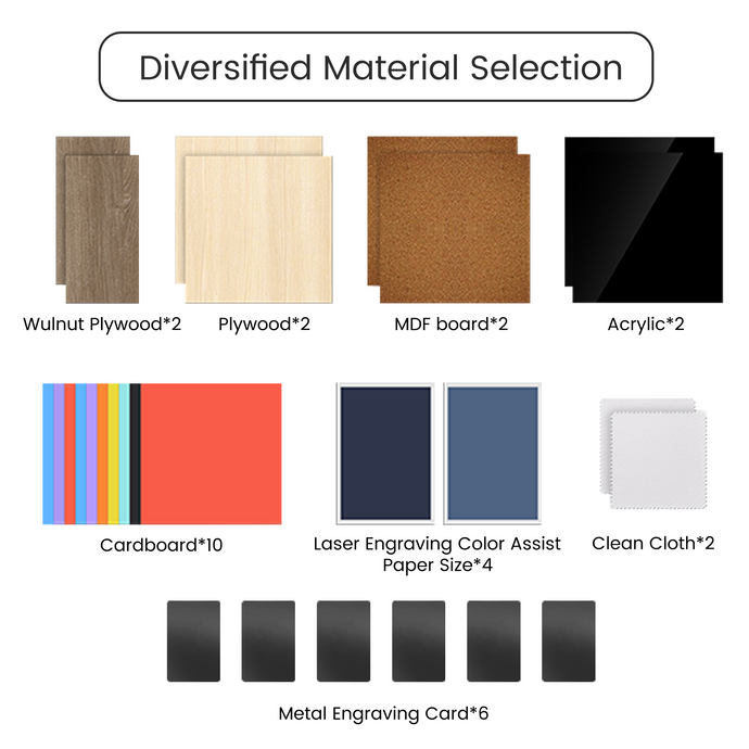 The materials pack includes a variety of high-quality materials like wood, metal, acrylic, and paper, perfect for diverse projects and ensuring detailed engraving results. Ideal for making personalized gifts and crafts, it also comes with free DXF files for laser engraving.